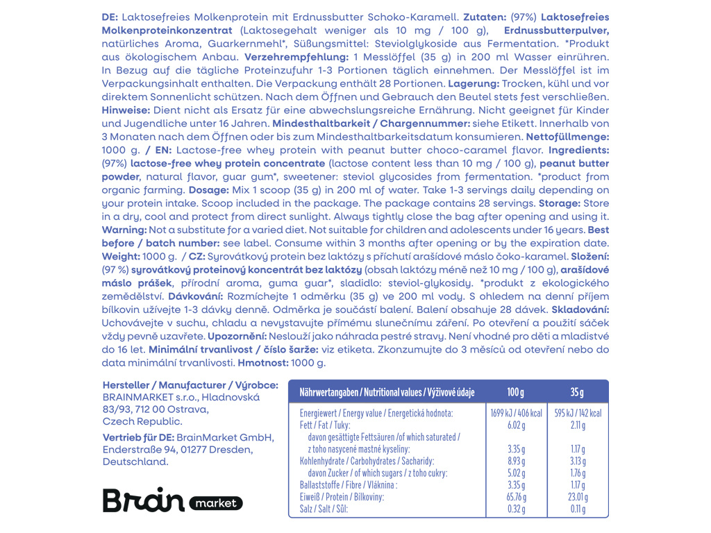 BrainMax Lactose Free Protein, Peanut Butter Choco-Caramel, 1000 g Bezlaktózový syrovátkový koncentrát, arašídy s karamelem a čokoládou, 28 dávek, doplněk stravy