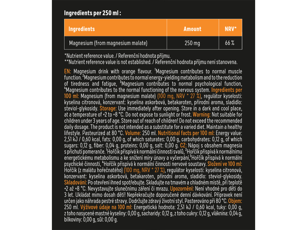 Složení: hořčík z malátu hořečnatého, regulátor kyselosti: kyselina citronová, konzervant: kyselina askorbová, betakaroten, přírodní aroma, sladidlo: steviol-glykosidy.