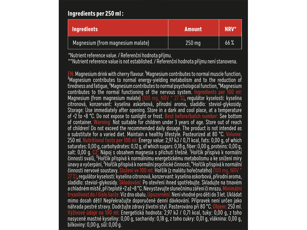 Praktický nápoj s obsahem 250 mg hořčíku ve formě hořčíku malátu.