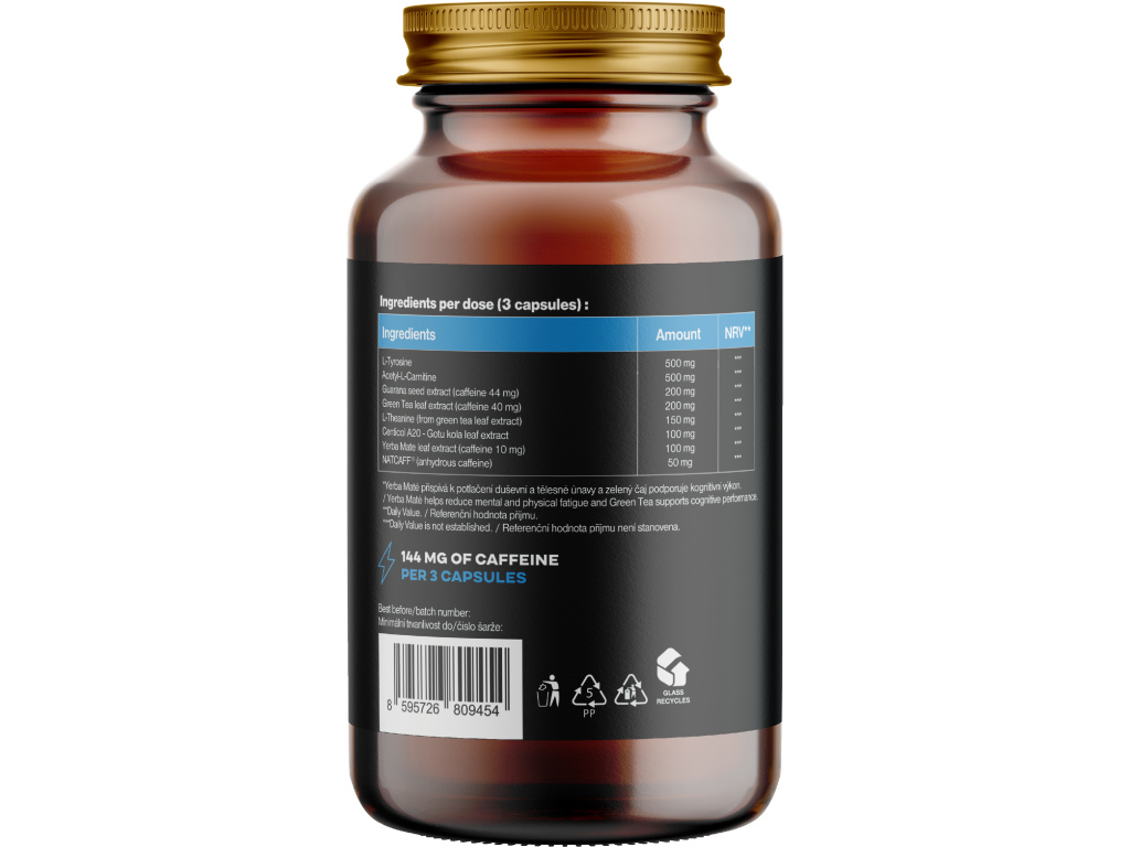 Složení: L-Tyrosin (500 mg, RHP **), Acetyl-L-karnitin (500 mg, RHP **), Extrakt ze semen guarany (200 mg, z toho kofein 44 mg, RHP *), Extrakt ze zeleného čaje (200 mg, z toho kofein 40 mg, RHP *), L-Theanin (z extraktu listů zeleného čaje) (150 mg, RHP *), Extrakt z Gotu koly (Centella asiatica) jako Centicol A20 (100 mg, RHP *), Extrakt z listů Yerba Maté (100 mg, z toho kofein 10 mg, RHP *), NATCAFF® bezvodý kofein (50 mg, RHP *).