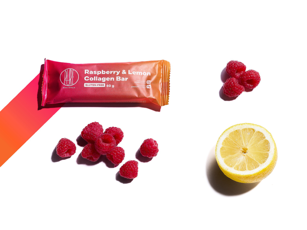 BrainMax Pure Raspberry & Lemon Collagen Bar, Kolagenová tyčinka, Malina a citron, 60 g 7 g grass-fed kolagenu, 14 g bílkovin, 11 g vlákniny