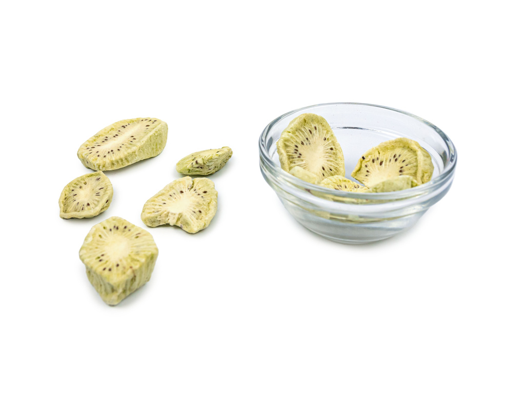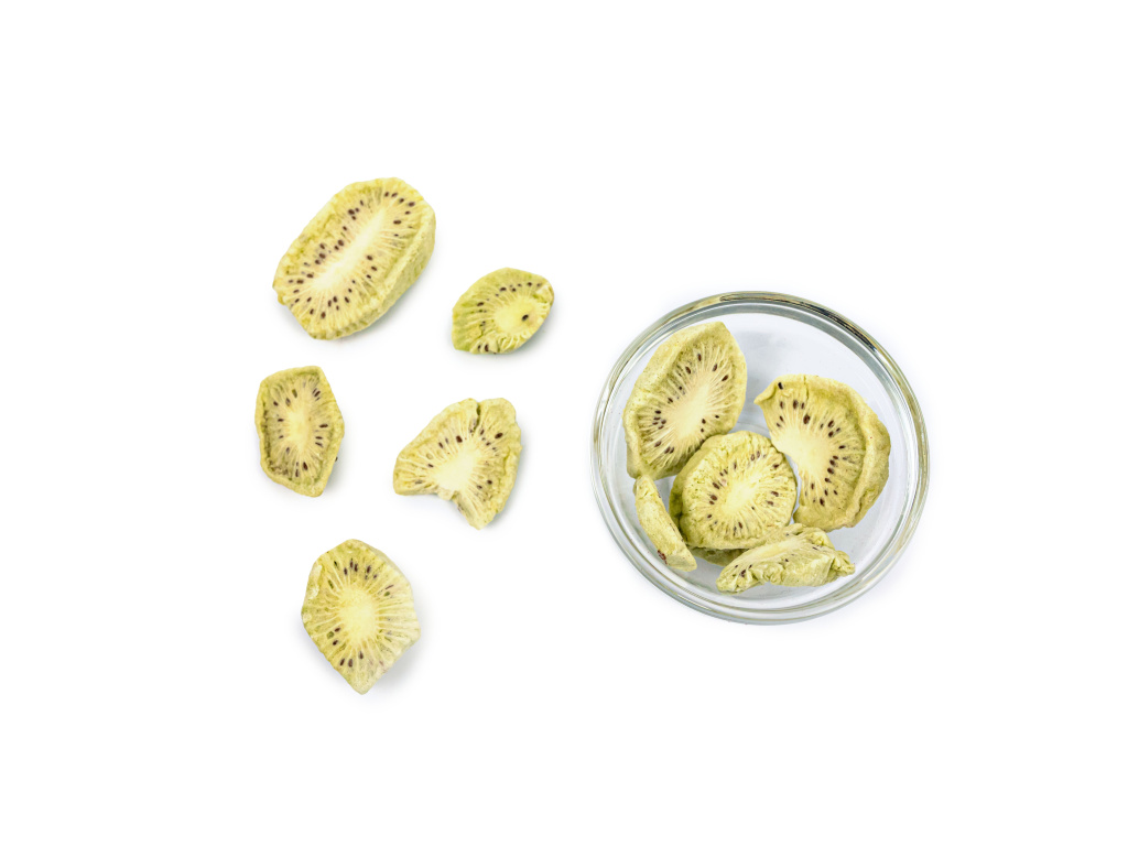 Kiwi má křupavou konzistenci a sladkokyselou chuť. Je přirozeně bohaté na vitamín C. Lyofilizované kiwi neobsahuje žádné konzervanty, přidaný cukr nebo aromata.