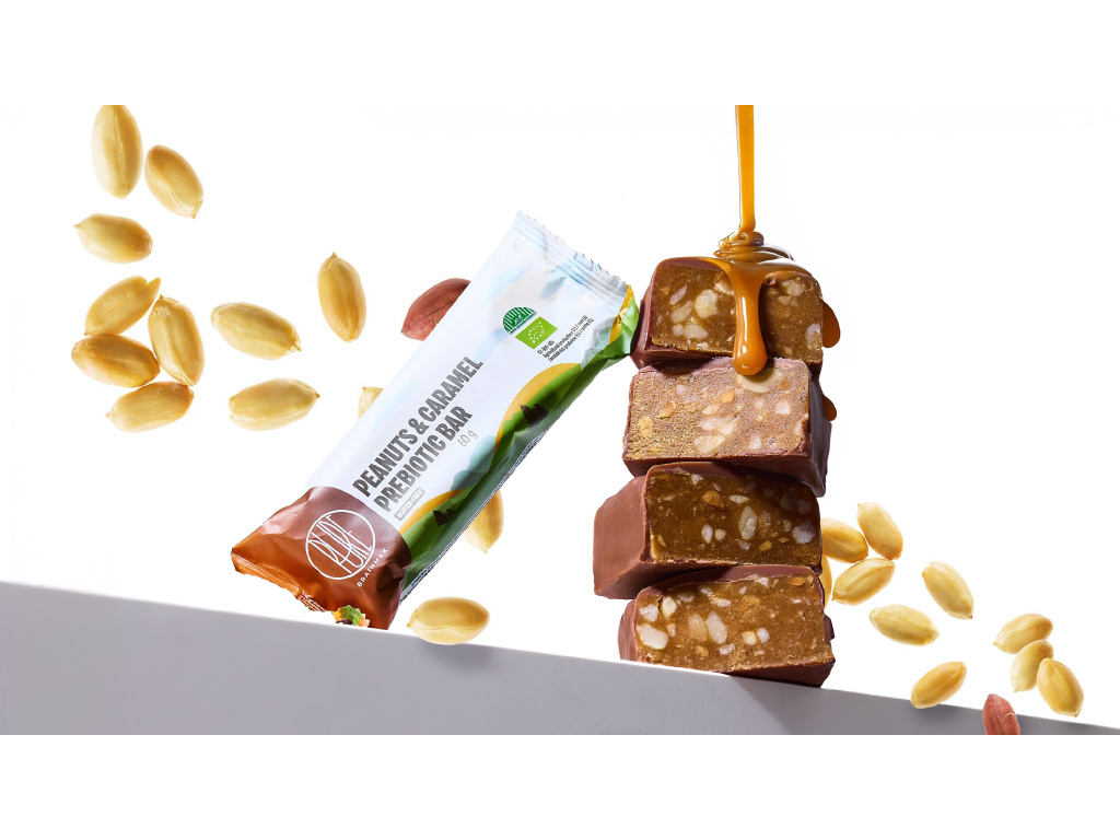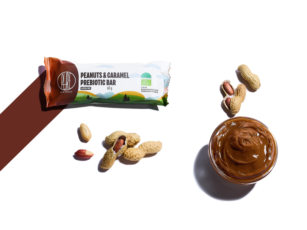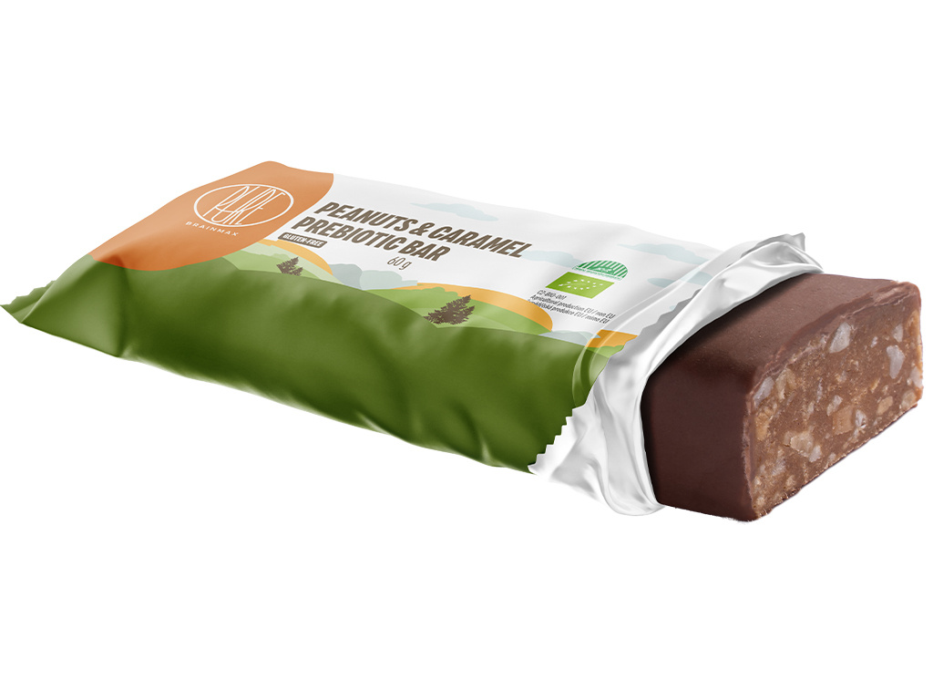 BrainMax Pure® Peanuts & Caramel Prebiotic Bar, prebiotická tyčinka, arašídy a karamel, BIO, 60 g *CZ-BIO-001 certifikát/ tyčinka s vlákninou, arašídy s příchutí karamelu