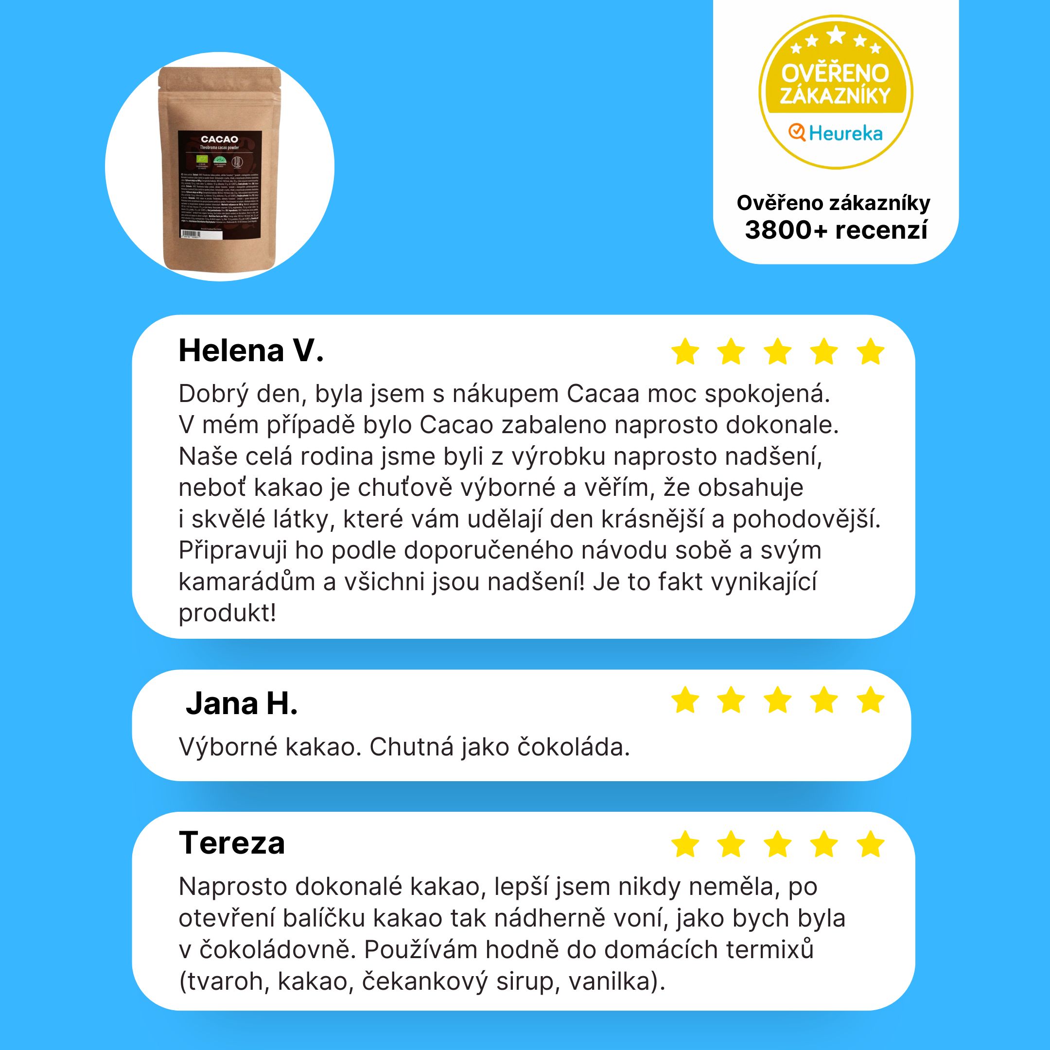 Byl jsem s produktem maximálně spokojený a objednal jsem za dobu co tu kakao prodávají nejméně 10 kg a žil jsem v tom, jak prospívá kakao mému tělu. Ještě když si člověk přečte veškerý text u tohoto produktu, tak si myslí, že pije nápoj bohů.