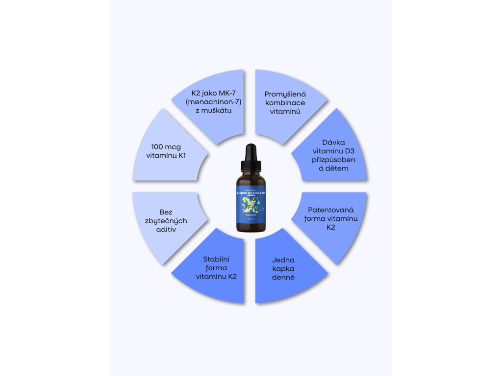 U dětských doplňků stravy je klíčová jistota, že dáváte svému dítěti jen to, co dává smysl a to, co opravdu funguje. Tento tekutý vitamín byl navržen s maximálním důrazem na kvalitu, čistotu a ověřené suroviny. Vitamín D3 pochází z rostlinných fytosterolů, vitamín K2 je v patentované formě MK-7 a spolu s vitamínem K1 tvoří pečlivě sestavenou kombinaci. Složení je zcela veganské, bez zbytečných příměsí a s přesným dávkováním jedné kapky denně, které rodičům dává kontrolu i pohodlí při každodenním užívání.