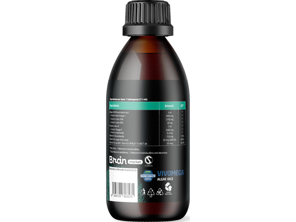 Složení: Olej z řas (Schizochytrium sp.), z toho celkem Omega 3 z toho DHA , z toho EPA, BIO olivový olej, z toho kyselina olejová, z toho Omega 9, z toho polyfenoly, Vitamín E (tokoferoly), Vitamín D3 veganský (z borovice), vitamín K2 jako MK-7 (z K2 VITAL® 1% MCT olej).