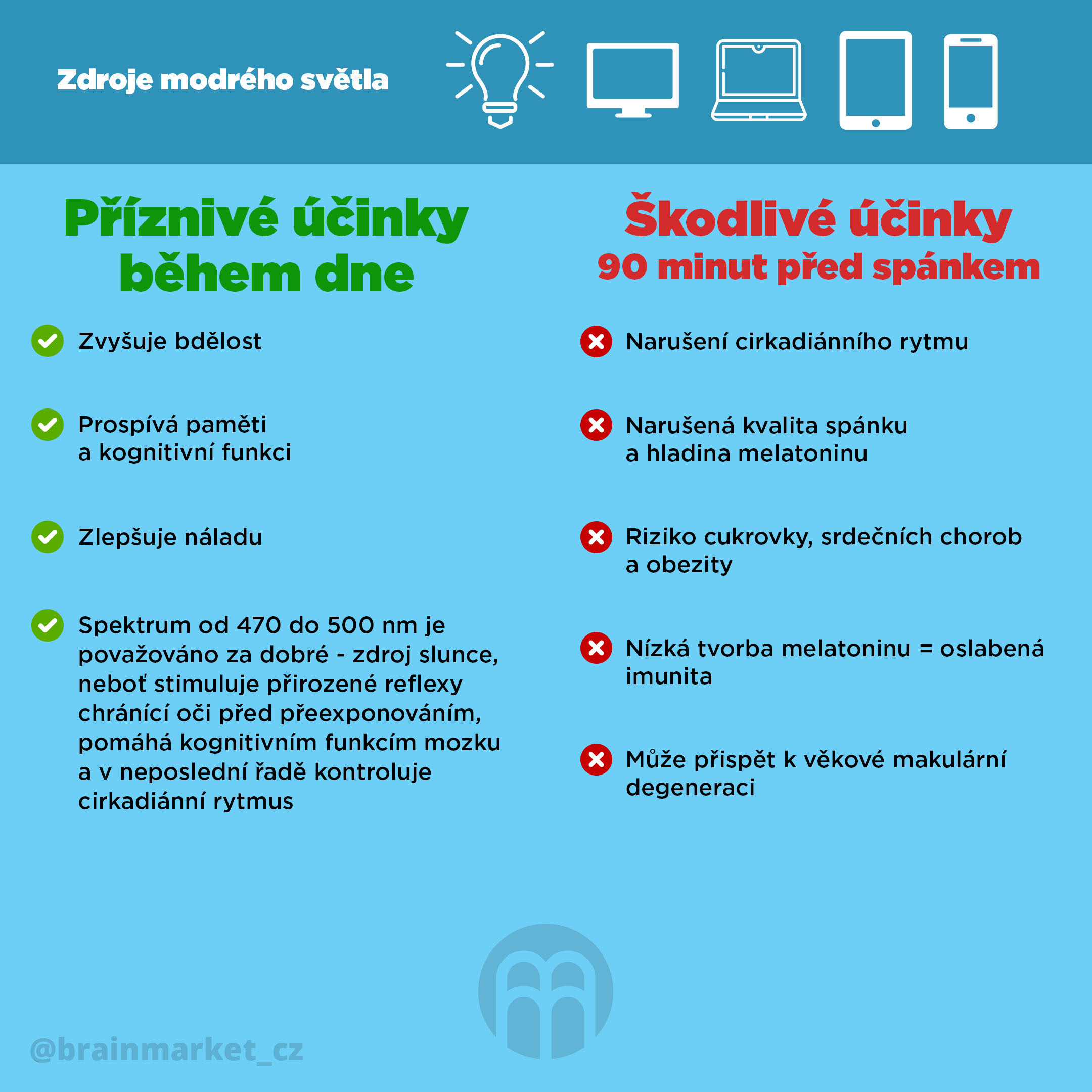 • Vystavení se modrému světlu z obrazovek před spaním narušuje produkci meIatoninu a spánkové vzory.