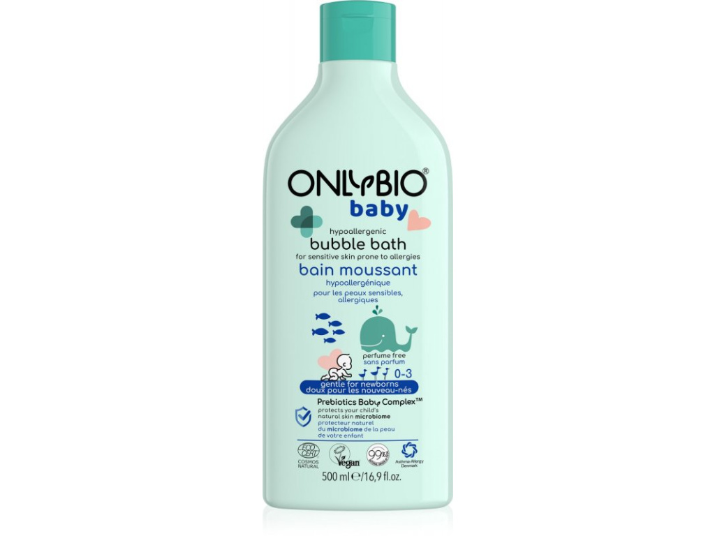 Extra jemná pěna bez parfemace promění obyčejnou koupel v načechrané bublinkové potěšení. Její receptura čerpá z 99 % z přírody a citlivě očistí a vyživí pokožku i úplně čerstvých miminek a drobků náchylných na alergie a ekzémy. Koupel s touto pěnou "nakrmí" pokožku vším důležitým, unikátní komplex prebiotik pak pomůže ochránit přirozený mikrobiom děťátka. V OnlyBio pěnu vyvinuli jedinečnou technologií biorafinace surfaktinu z řepky z lokálních zdrojů a nejlépe se hodí pro škvrňata od narození do 3 let. Za kvalitu ručí certifikace Ecocert, za ultra šetrnost Asthma Allergy Denmark a doporučuje ji i Polská dermatologická společnost.