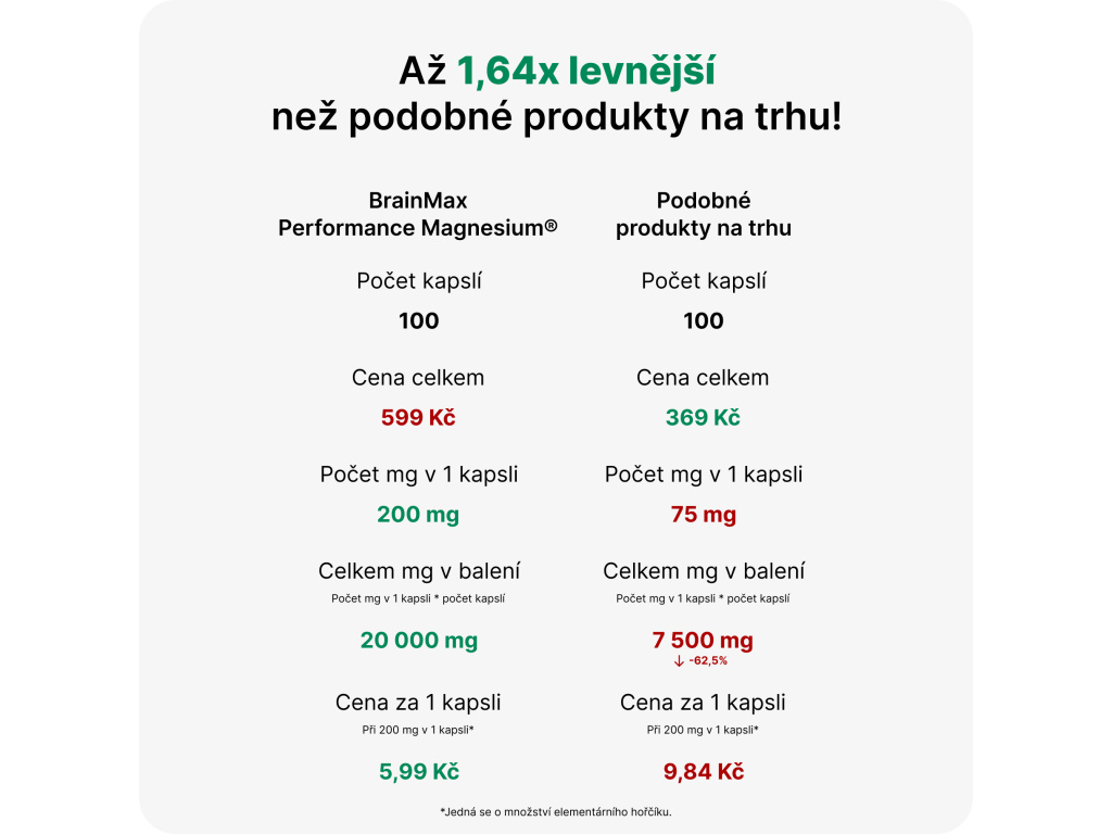 Při přepočtu hořčíku (účinné látky) vychází naše magnésium až 1,64x levněji než je průměr na trhu u podobných produktů