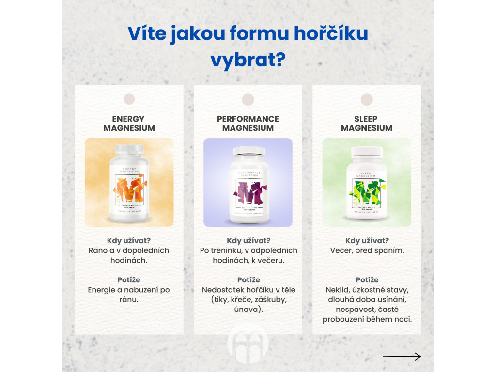 Pro správné doplnění hořčíku v průběhu dne je ideální začít ráno s Energy Magnesium®, které obsahuje hořčík malát přispívající k normálnímu energetickému metabolismu. Performance Magnesium®, které kombinuje hořčík bisglycinát a vitamín B6, doplňujte po fyzické aktivitě nebo odpoledne, aby přispělo k normální činnosti nervové i svalové soustavy a snížení únavy a vyčerpání. Sleep Magnesium® užívejte zhruba 30 minut před spaním. Tento doplněk obsahuje hořčík bisglycinát a další látky, které mají vliv na kvalitu spánku.