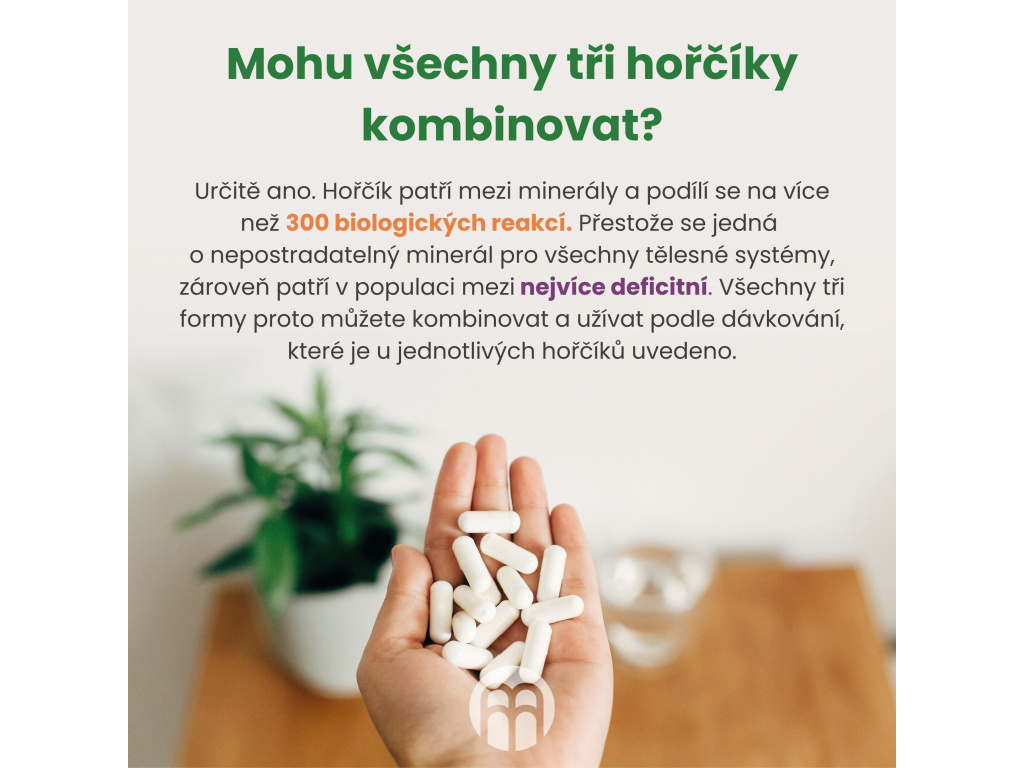 - Chelátová organická forma: Hořčík + aminokyselina glycinu.