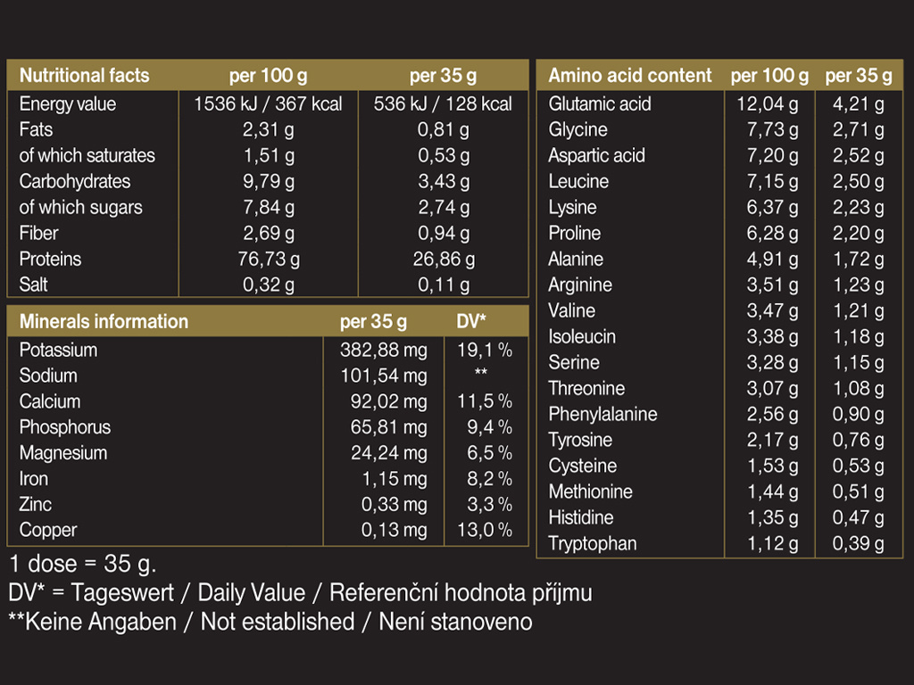 Upozornění: Doplněk s vyšší koncentraci bílkovin, který nenahrazuje pestrou stravu. Nevhodné pro děti, mladistvé do 16 let, těhotné a kojící ženy. Nepřekračujte doporučenou denní dávku.
