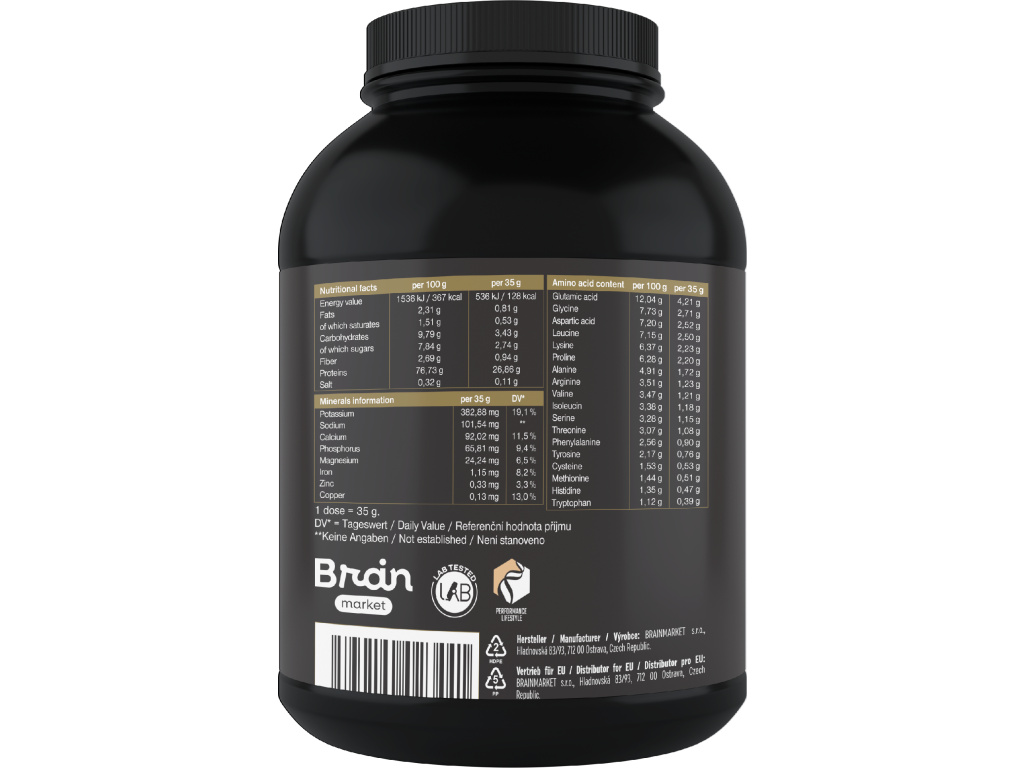 Upozornění: Doplněk s vyšší koncentraci bílkovin, který nenahrazuje pestrou stravu. Nevhodné pro děti, mladistvé do 16 let, těhotné a kojící ženy. Nepřekračujte doporučenou denní dávku.