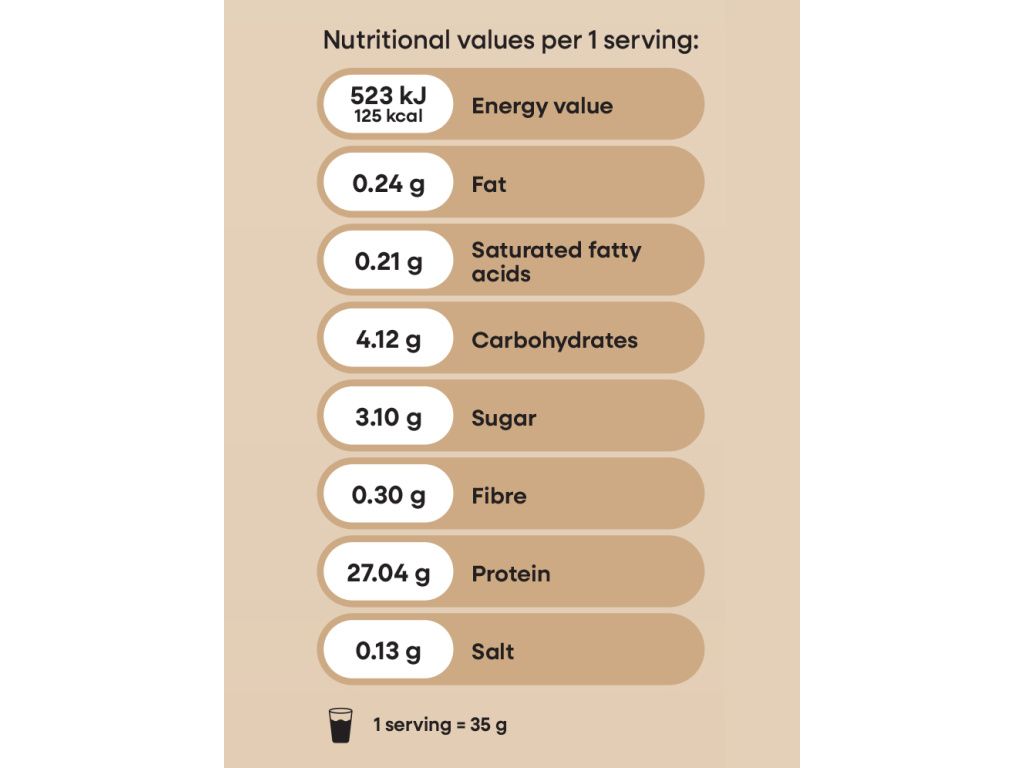 Příjemnou nasládlou chuť proteinu propůjčily lístky stévie – bylinky, která je až 300× sladší než cukr a neobsahuje žádné kalorie. Pro krémovější konzistenci jsme použili semena guarových plodů, která přirozeně obsahují vlákninu.