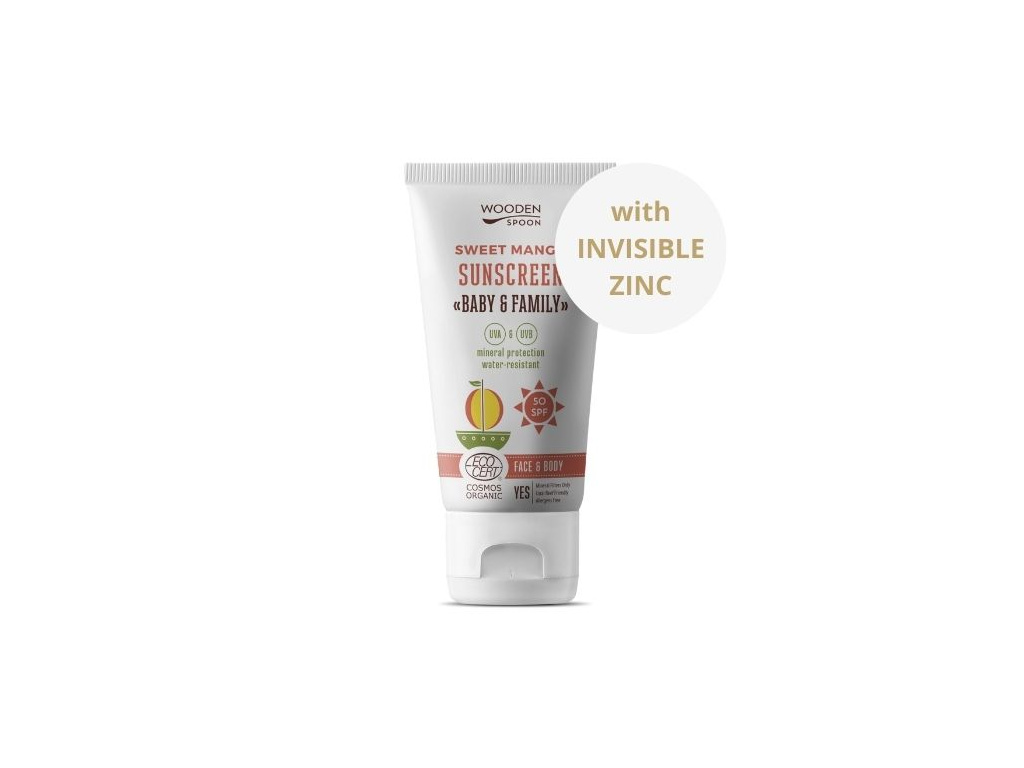 Wooden Spoon Opalovací tělové mléko Mango Baby & Family SPF 50, 150 ml Přírodní minerální opalovací mléko s vůní manga.